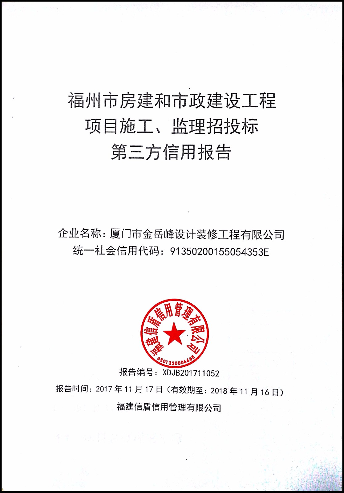 廈門市金岳峰設計裝修工程有限公司 XDJB201711052