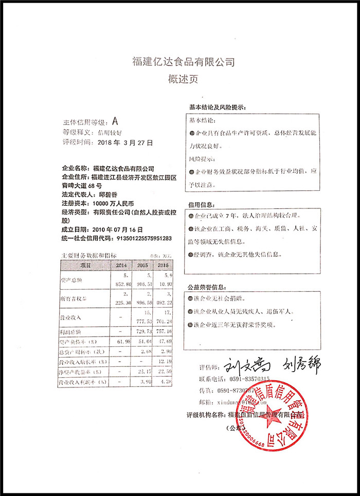 福建億達食品有限公司 XDPJ201803181